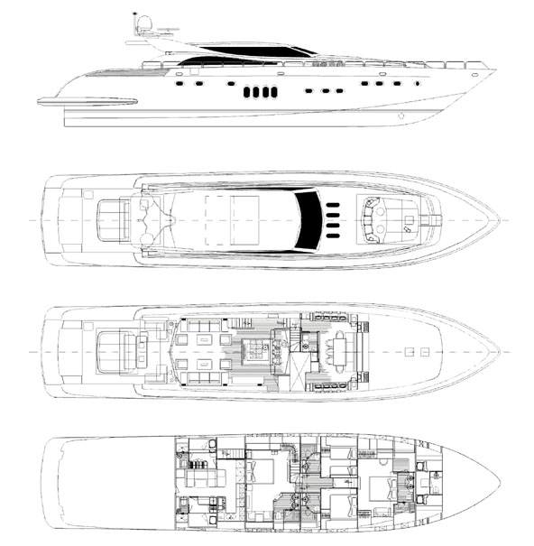 Very spacious sunbathing areas up forward on the bow and back on the aft deck satisfy highest demands for an open style yacht.