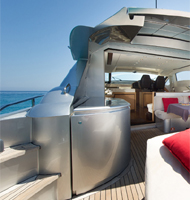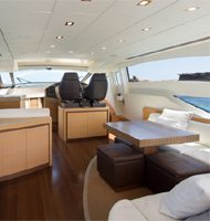 When you first step on board of the Pershing 72 you can appreciate the designers vision which obviously had entertaining in mind. The open plan saloon is surrounded by the large side windows at all points of the compass which creates fantastic visibility for all guests at all time. One of the boats unique features is the glass window and saloon door that separate the saloon from the cockpit can be fully retracted into the floor of the boat. This clever design allows for the cockpit and saloon to flow into one great venue for day or evening entertaining. |
