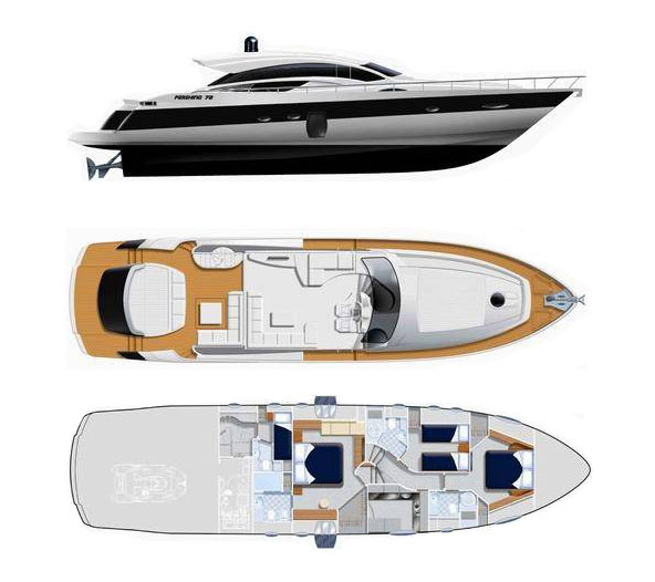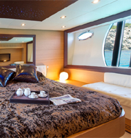 The sleeping quarters are split into three cabins and three bathrooms. The stand out is the sophisticated comfort of the full beam master cabin, which is amazingly bright and sunny thanks to two special open-view windows offering spectacular sea views. The guest cabin has twin single beds and a third stowaway berth and a VIP cabin with one large bed and an en-suite bathroom. |