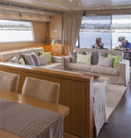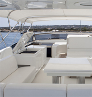 This Sanlorenzo SL 82 has plenty of exterior living on 2 spacious decks. The saloon leads directly to the shaded aftdeck and an alfresco dining option, perfect for socializing casually, or formally. Wrapping around the yacht 360 degree, the main deck provides easy access to the foredeck and a large raised sunpad. The yacht boasts an upper sundeck, featuring an additional alfresco dining option, service station, seating, sunpads and removable shade. |
