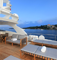This Sanlorenzo SL 100 offers four luxurious cabins on two decks and a lot of space outside, especially on the sun deck shaded partially by a hardtop with electric sliding section. |