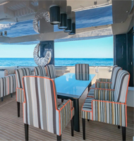 Ihr Deckshaus besteht fast vollständig aus doppelschichtigem, reflektierendem Glas, das dem Innenraum eine helle und luftige Atmosphäre verleiht. Die Jalousien an der Decke und den Seiten garantieren im Bedarfsfall Schatten oder mehr Privatsphäre.