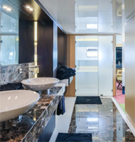 Motorleistung / Anzahl Motoren / Kraftstoff 730 hp / 2 / Diesel Raumaufteilung / Kabinen ![]() The yacht has four guest cabins on the lower deck, including the full-beam owner’s en suite cabin amidships. Forward, the large VIP cabin has a double berth on the centerline and a dressing area. Between the master and VIP staterooms, two mirror-image en suite twin cabins are located.