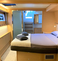 aft cabin: access from the cockpit through the sliding window, double bed with lateral access (2.05 x 1.60 m), 2 opening deck hatches, 1 hull window with 1 integrated opening porthole