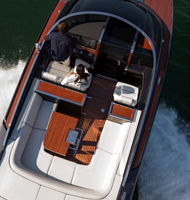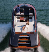 Die Optik der Rivamare wird durch die umlaufend getönte Windschutzscheibe in Verbindung mit dem für Riva typischen, schlanken Bug dominiert. Achtern fallen sofort die Stufen ins Auge, die ein komfortables Ein- und Aussteigen ermöglichen und zur per Knopfdruck ausfahrbaren Badeplattform führen. Diese verfügt als Clou über zwei Liegesitze zu Seiten der Treppe.