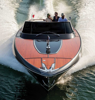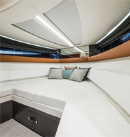 Für Sonnenanbeter erstreckt sich auf dem Heck zudem eine große, weiß gepolsterte Liegefläche. Ausgelegt für acht Personen finden weitere Gäste auf der C-förmigen Bank hinter dem Fahrer- und Beifahrersitz oder im Interieur Platz. Eine Pantry sowie WC und separate Dusche sind vorhanden, sodass sich die kleine Yacht auch für Wochenendausflüge eignet.