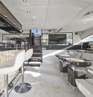 Die schon werksseitig sehr umfangreiche Ausstattung ist nochmals durch mannigfaltiges Sonderzubehör wie 2 Generatoren, 2 Water Maker, Jacuzzi, Jetski Kran auf der Flybridge, Hammam mit Zugang vom Cockpit und vielen anderen Dingen auf allerhöchstes Niveau an Luxus gebracht worden.