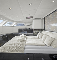 Motorleistung / Anzahl Motoren / Kraftstoff 800 hp / 2 / Diesel Raumaufteilung / Kabinen ![]() Master Stateroom: Located forward with an island bed and the possibility of direct access to the en-suite bathroom having a separate toilet and shower compartment, the stateroom is offering stunning 180° views through large panoramic windows. VIP Stateroom: Located amidships to starboard with double bed, desk and a very spacious and luxurious en-suite bathroom. Guest Cabin 1: Located amidships to port with double bed, desk and an en-suite bathroom. Guest Cabin 2: Located to port with two single beds and an en-suite bathroom. Hammam: Located to port with a separate entrance from the exterior cockpit, a heated corner bench for up to 5 people and a shower installed. 2 Crew Cabins Located in both bows, each having toilet and shower. Motor (Motoryacht) bzw. Takelage und Segel (Segelyacht)